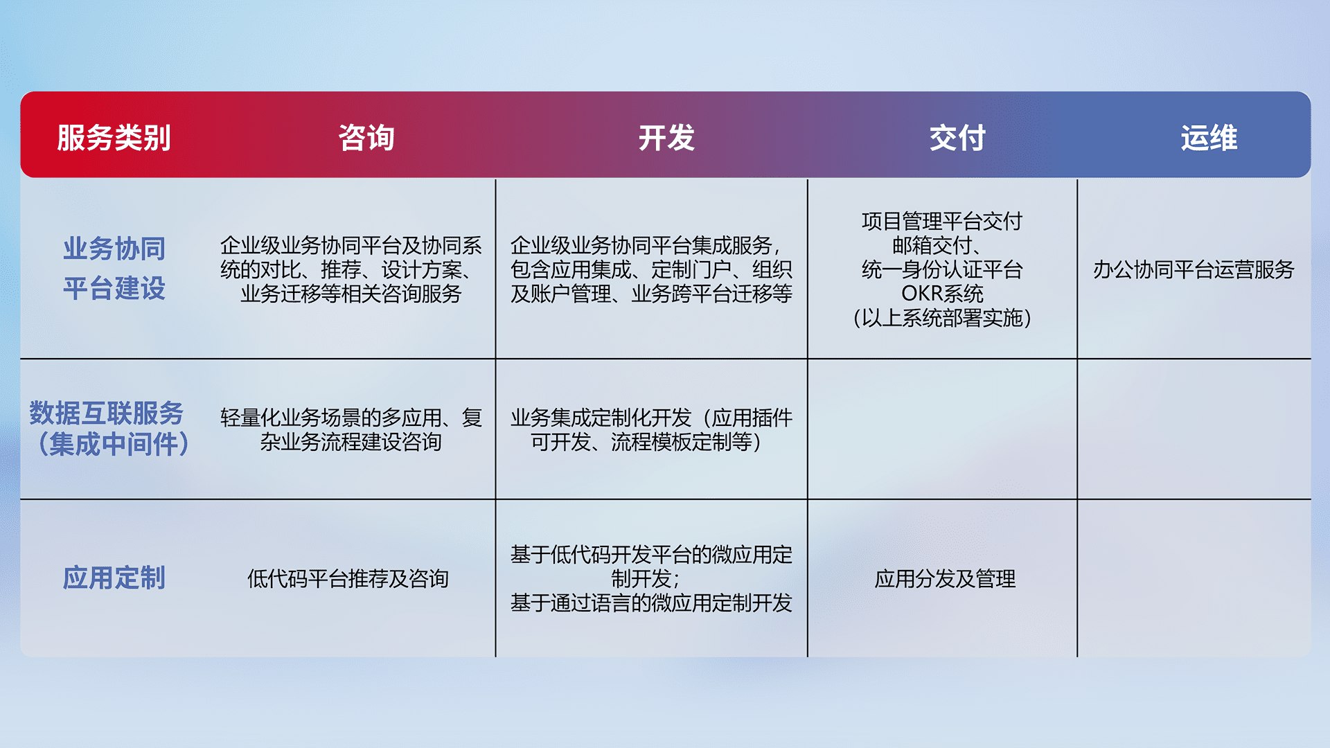 针对钉钉、、、、企微、、、、IDaas等平台级产品提供产品的规划、、、方案、、、、交付、、、定制化开发等服务,,,实现如统一协同办公、、智能客户服务、、、、混合会议管理、、、智能数据查询、、、等业务场景,,,实现数字化转型。。。